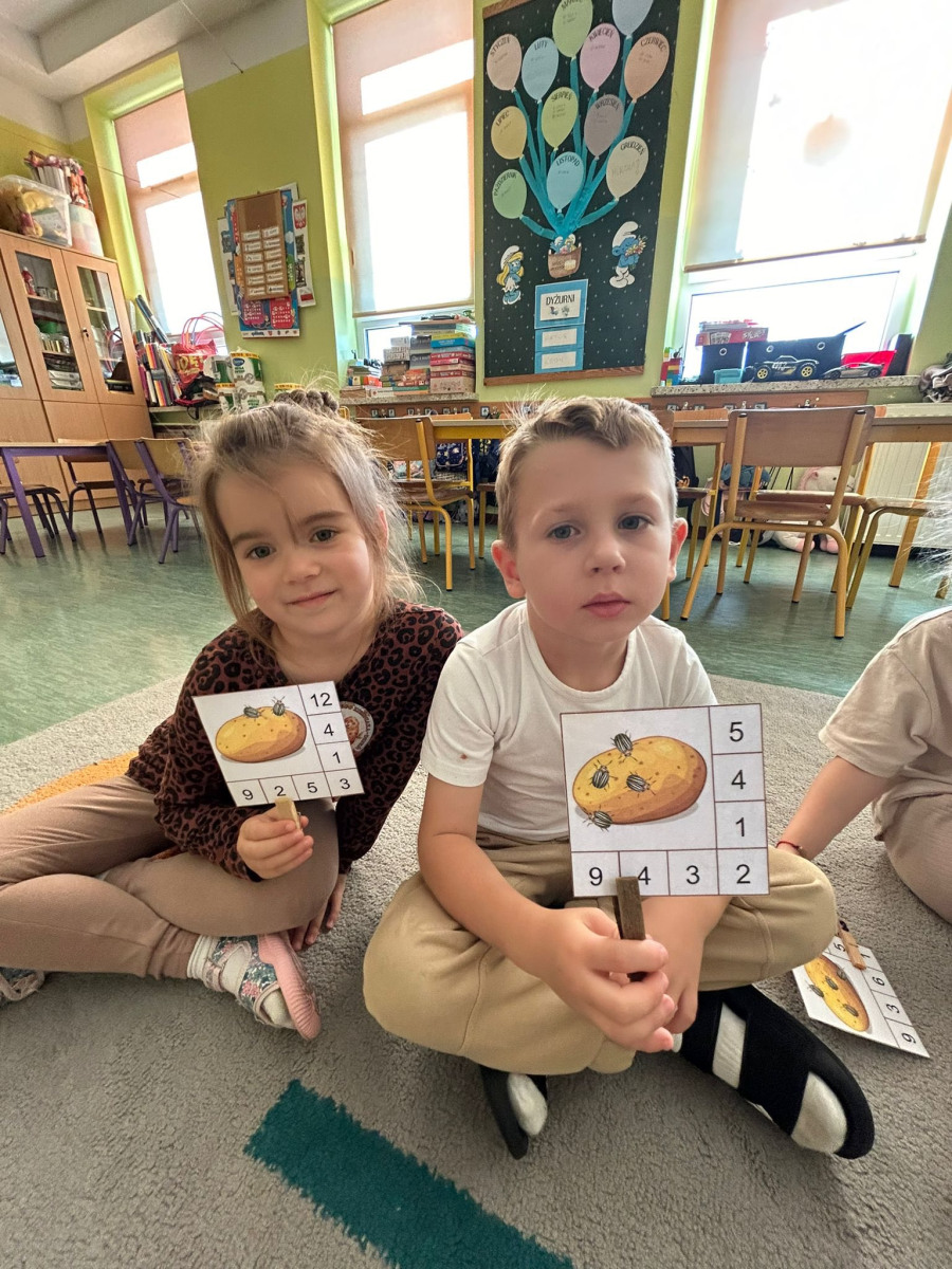 Podczas zajęć matematycznych dzieci rozwiązywały zadania w zabawie „Policz stonki” – liczyły owady, porównywały ich liczebność i odpowiadały na proste pytania matematyczne.
