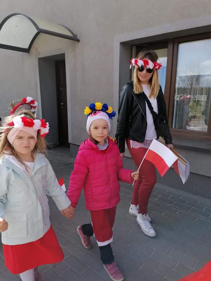 RAJD W BARWACH NARODOWYCH???? Gminna impreza dla uczczenia narodowego święta zgromadziła uczniów ze wszystkich szkół i przedszkoli. Idzie nas około 250 osób. Mali patrioci z naszej szkoły również uczestniczyli w marszu??.