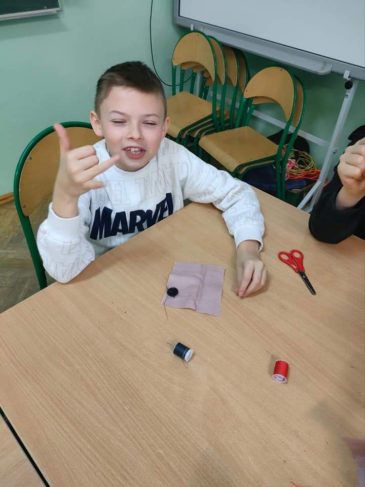 W tym tygodniu tematem zajęć świetlicowych są różnego rodzaje talenty. Dlatego też klasa czwarta postanowiła spróbować swoich sił w szyciu. Zaczęli od podstawowej rzeczy, a mianowicie od nauki przyszywania guzików.