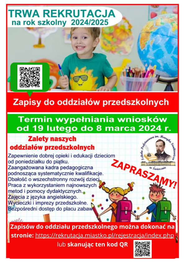 Serdecznie zapraszamy wszystkich rodziców do zapisania dzieci do oddziałów przedszkolnych w naszej szkole! Aby to zrobić skorzystaj z kodu QR na poniższym plakacie lub wejdź na stronę: https://rekrutacja.miastko.pl/rejestracja/index.php