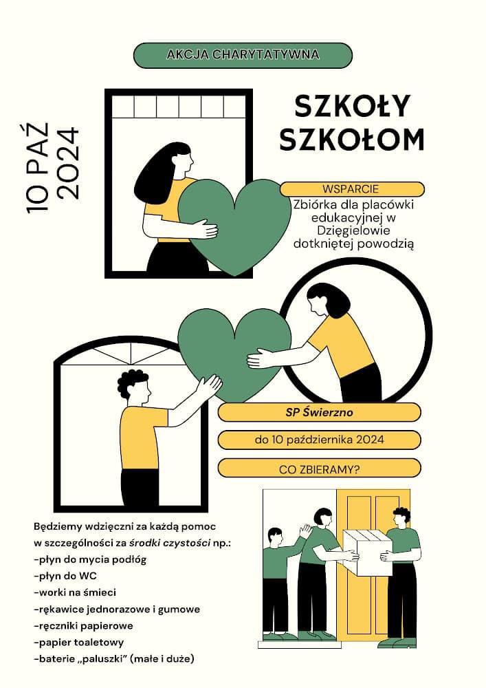 Organizujemy zbiórkę darów dla powodzian w ramach akcji „Szkoły Szkołom”. Nasza pomoc skierowana będzie do Przedszkola Publicznego w Puńcowie w Zespole Szkolno-Przedszkolnym w Dzięgielowie.
