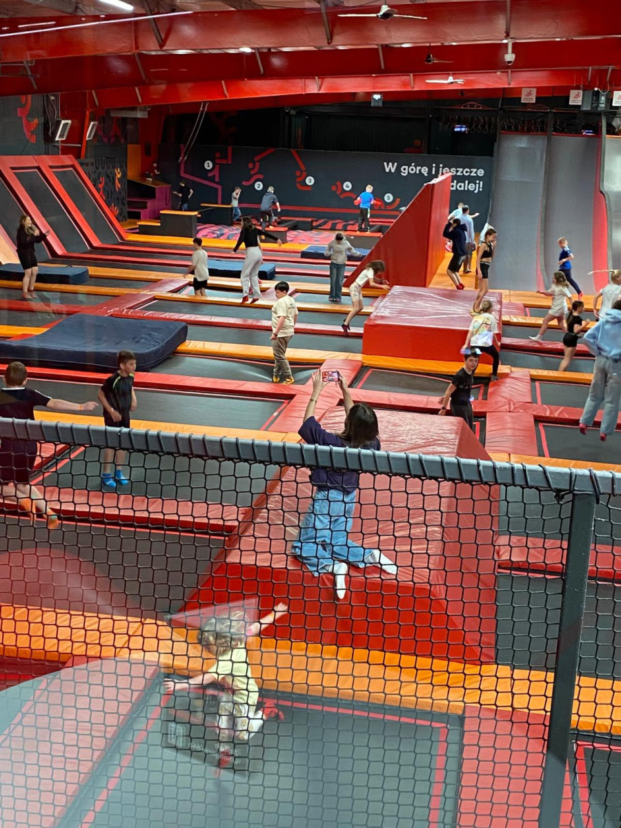Po pysznym śniadaniu sprawnie uporaliśmy się z pakowaniem i porządkami, a następnie ruszyliśmy do warszawskiego parku trampolin-Hangar 646! 🤸‍♂️ Było mnóstwo skakania, akrobacji i śmiechu! 😄