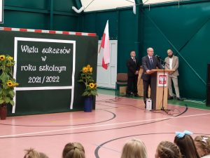 Na uroczystość rozpoczęcia roku szkolnego 2021/2022 przybyli uczniowie, nauczyciela, pracownicy obsługi i administracji oraz rodzice.