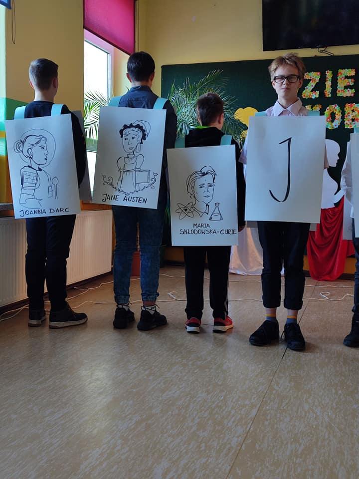 Chłopaki przygotowali się bardzo profesjonalnie, co świadczy o ich zaangażowaniu w przygotowanie i opisanie również kilku z najbardziej zasłużonych Kobiet na świecie. A najmłodsi uczniowie naszej szkoły zaśpiewali piosenkę.