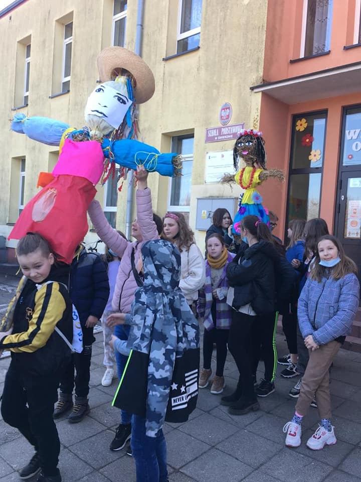 Pierwszy Dzień Wiosny w naszej szkole tym razem nieco inaczej. Na naszych uczniów czekało wiele atrakcji. Na początek Mini lista przebojów, w której pochwalić się mogli chętni uczniowie. Jury miało bardzo twardy orzech do zgryzienia. Bo nasi uczniowi zaprezentowali swoje talenty, a wybór zwycięzcy nie należał do łatwych. Do tego plakaty i krzyżówki z wiosennymi hasłami. Ale zabraknąć nie mogło przecież pożegnania zimy oraz przywitania wiosny. Kolorowy pochód z Marzannami, w pobliżu szkoły – każda klasa przygotowała swoją Marzannę, dopełnił całości a kto miał ochotę mógł przejechać się na koniku. Na zakończenie przepyszne kiełbaski prosto z ogniska. Uśmiech i radość dzieci bezcenne.
