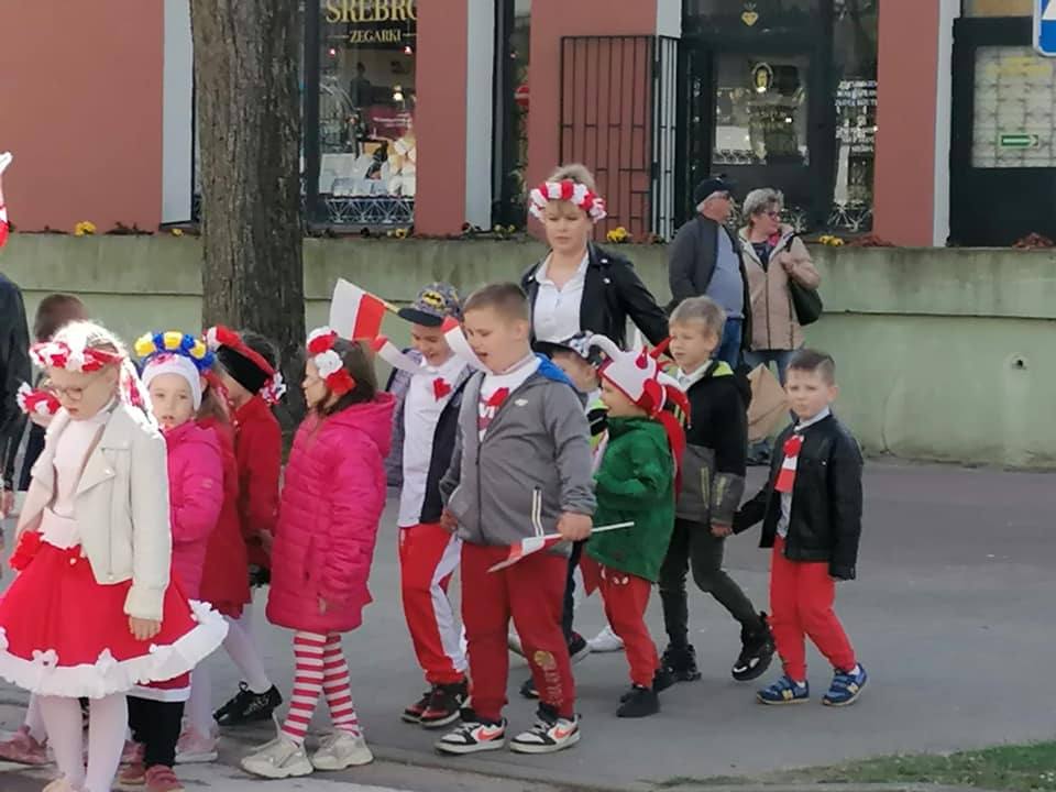 RAJD W BARWACH NARODOWYCH???? Gminna impreza dla uczczenia narodowego święta zgromadziła uczniów ze wszystkich szkół i przedszkoli. Idzie nas około 250 osób. Mali patrioci z naszej szkoły również uczestniczyli w marszu??.