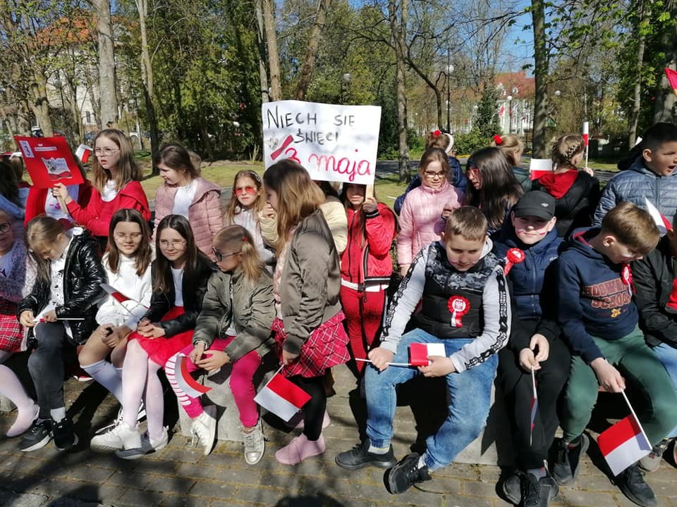 RAJD W BARWACH NARODOWYCH???? Gminna impreza dla uczczenia narodowego święta zgromadziła uczniów ze wszystkich szkół i przedszkoli. Idzie nas około 250 osób. Mali patrioci z naszej szkoły również uczestniczyli w marszu??.