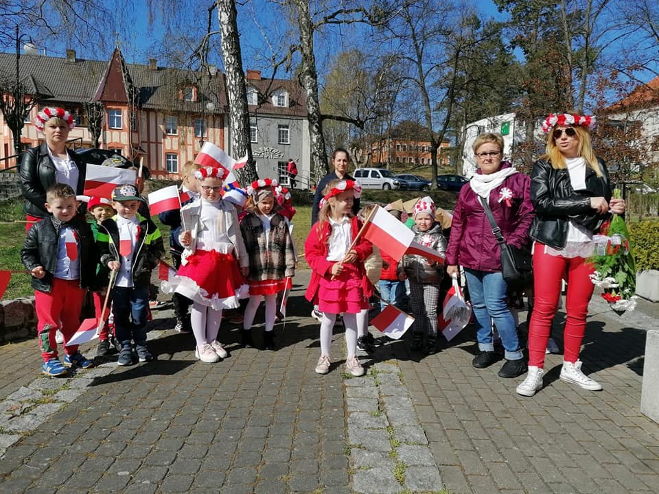 RAJD W BARWACH NARODOWYCH???? Gminna impreza dla uczczenia narodowego święta zgromadziła uczniów ze wszystkich szkół i przedszkoli. Idzie nas około 250 osób. Mali patrioci z naszej szkoły również uczestniczyli w marszu??.