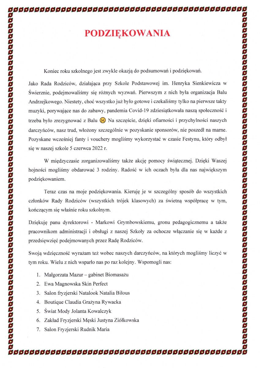 Podziękowania od Rady Rodziców dla wszystkich darczyńców, sponsorów, przyjaciół szkoły, rodziców, nauczycieli i wszystkich osób, które włożyły swoje całe serducho oraz dołożyły cegiełkę w akcje organizowane przez Radę Rodziców podczas trwania całego roku szkolnego 2021/2022.