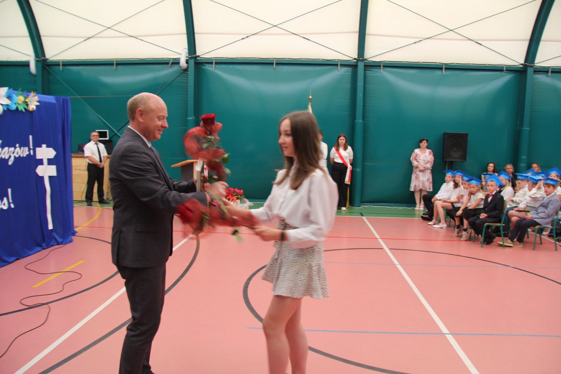 Ostatni dzwonek już za nami. Rok szkolny 2021/2022 dobiegł końca. Na uroczystości Pan Dyrektor Marek Grymbowski wręczył świadectwa i dyplomy dla najzdolniejszych uczniów oraz podziękowania dla rodziców za trud i wychowanie tak wspaniałych dzieci. Słowa wdzięczności i podziękowania za pracę skierował również do wszystkich nauczycieli, pracowników szkoły, rodziców i uczniów. Tym samym życząc owocnej pracy w przyszłym roku szkolnym. Pożegnaliśmy również najstarszych uczniów naszej szkoły, którzy opuszczają mury oraz Panią Bożenkę, która po wieloletniej pracy dydaktycznej przechodzi na zasłużoną emeryturę.