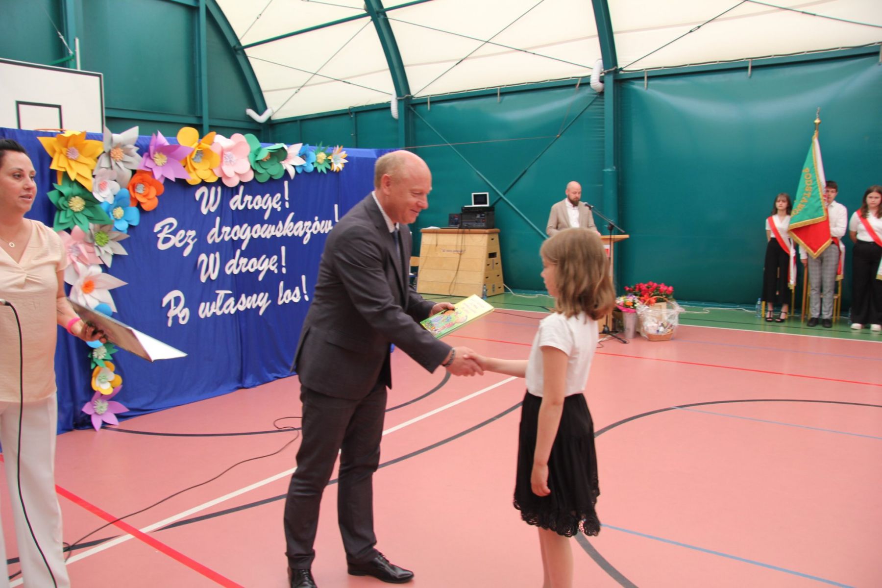 Ostatni dzwonek już za nami. Rok szkolny 2021/2022 dobiegł końca. Na uroczystości Pan Dyrektor Marek Grymbowski wręczył świadectwa i dyplomy dla najzdolniejszych uczniów oraz podziękowania dla rodziców za trud i wychowanie tak wspaniałych dzieci. Słowa wdzięczności i podziękowania za pracę skierował również do wszystkich nauczycieli, pracowników szkoły, rodziców i uczniów. Tym samym życząc owocnej pracy w przyszłym roku szkolnym. Pożegnaliśmy również najstarszych uczniów naszej szkoły, którzy opuszczają mury oraz Panią Bożenkę, która po wieloletniej pracy dydaktycznej przechodzi na zasłużoną emeryturę.