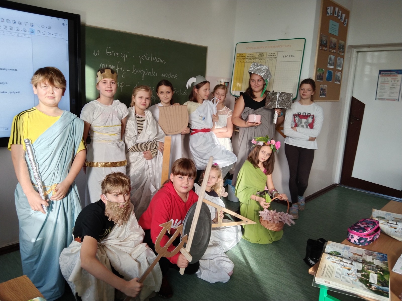 Klasa V przygotowała nietypową lekcję historii, dotyczącą wierzeń starożytnych Greków. Uczniowie wcielili się w role greckich bogów. Na lekcji pojawił się między innymi władca mórz- Posejdon, najpiękniejsza z bogiń – Afrodyta, opiekun sztuki – Apollo , dzierżący w dłoni kowalski młot Hefajstos, a także bogini urodzaju – Demeter.