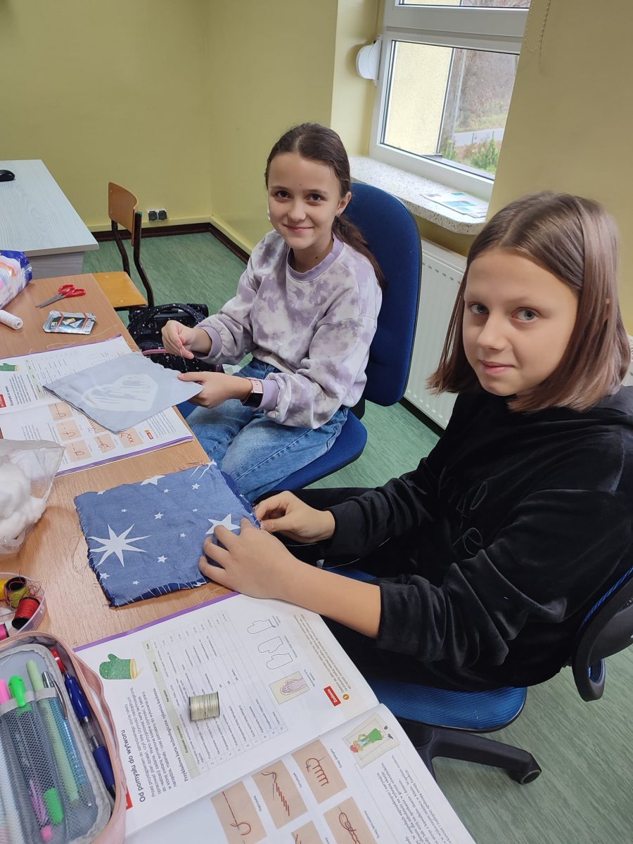 Dla niektórych uczniów było to pierwsze spotkanie ze ściegiem i łączeniem materiałów. Każdy przygotował dla siebie milutką podusię.