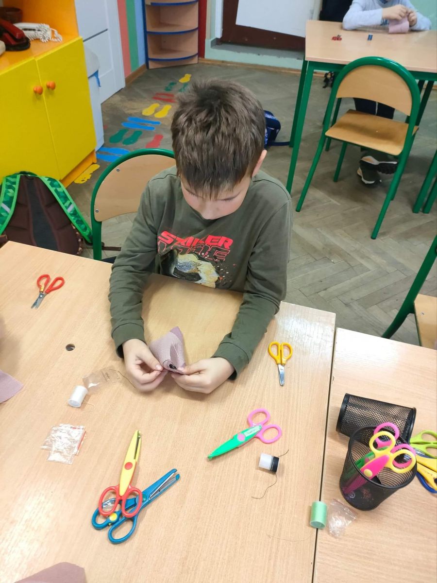 W tym tygodniu tematem zajęć świetlicowych są różnego rodzaje talenty. Dlatego też klasa czwarta postanowiła spróbować swoich sił w szyciu. Zaczęli od podstawowej rzeczy, a mianowicie od nauki przyszywania guzików.