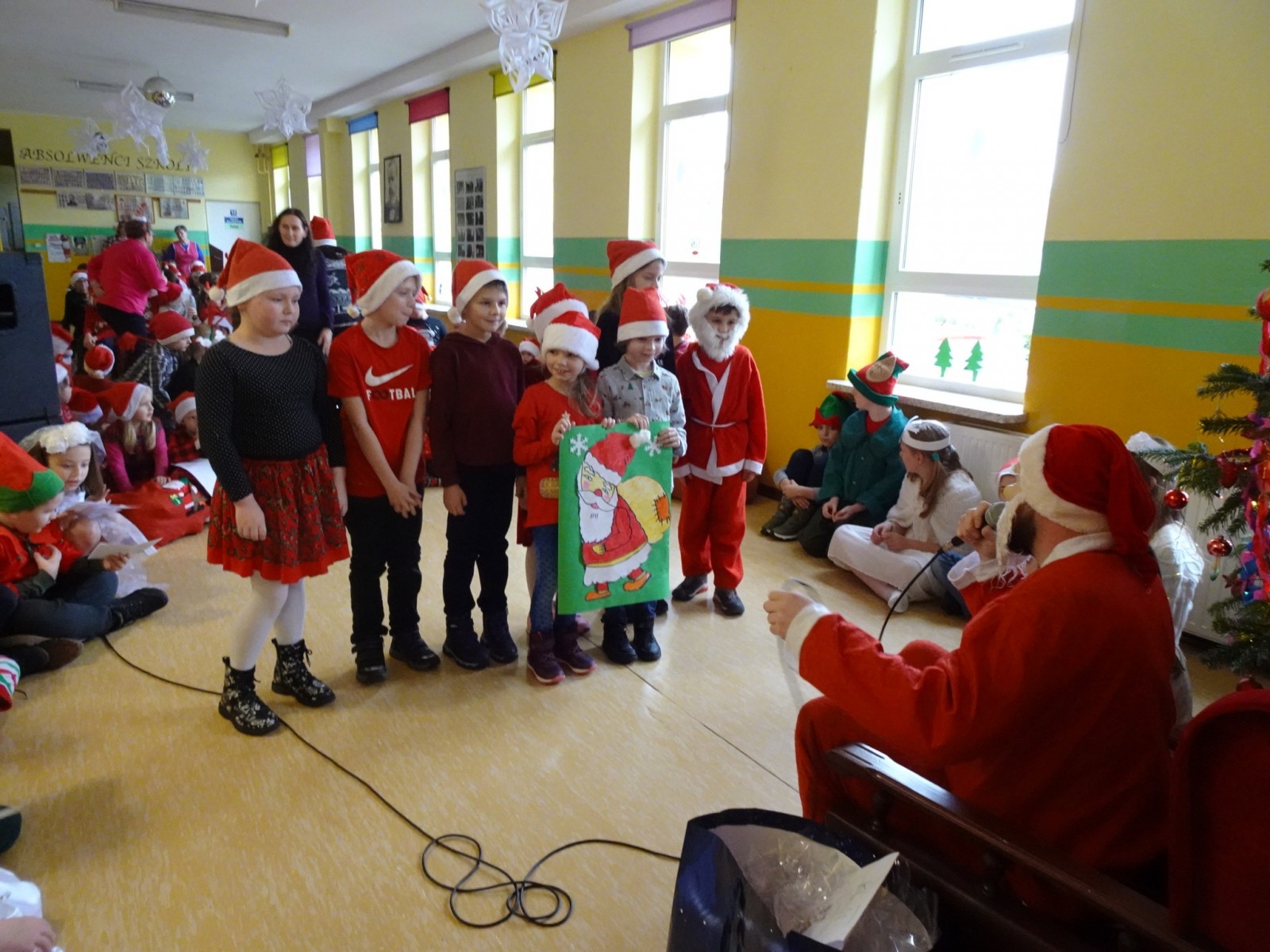 Szóstego grudnia, jak dobrze wiecie Święty Mikołaj chodzi po świecie. Odwiedza domy, przedszkola i szpitale. Ale o naszej szkole też nie zapomniał wcale. Dlatego jest On taki Święty, co dużym i małym przynosi prezenty.
