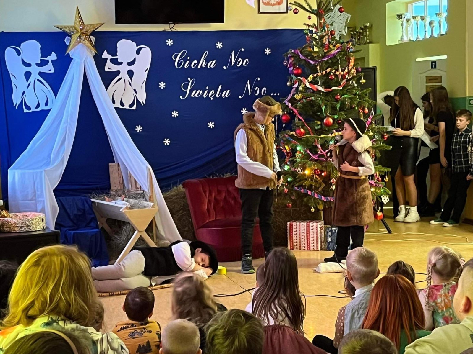 Dzisiaj w naszej szkole panowała wyjątkowo świąteczna atmosfera, a wszystko za sprawą Jasełek przygotowanych przez uczniów klas: II, III, IV i VI.Dzieci z dużym zaangażowaniem odgrywały swoje role. Uroku dodawały kolędy zaśpiewane przez uczniów klasy VIII.