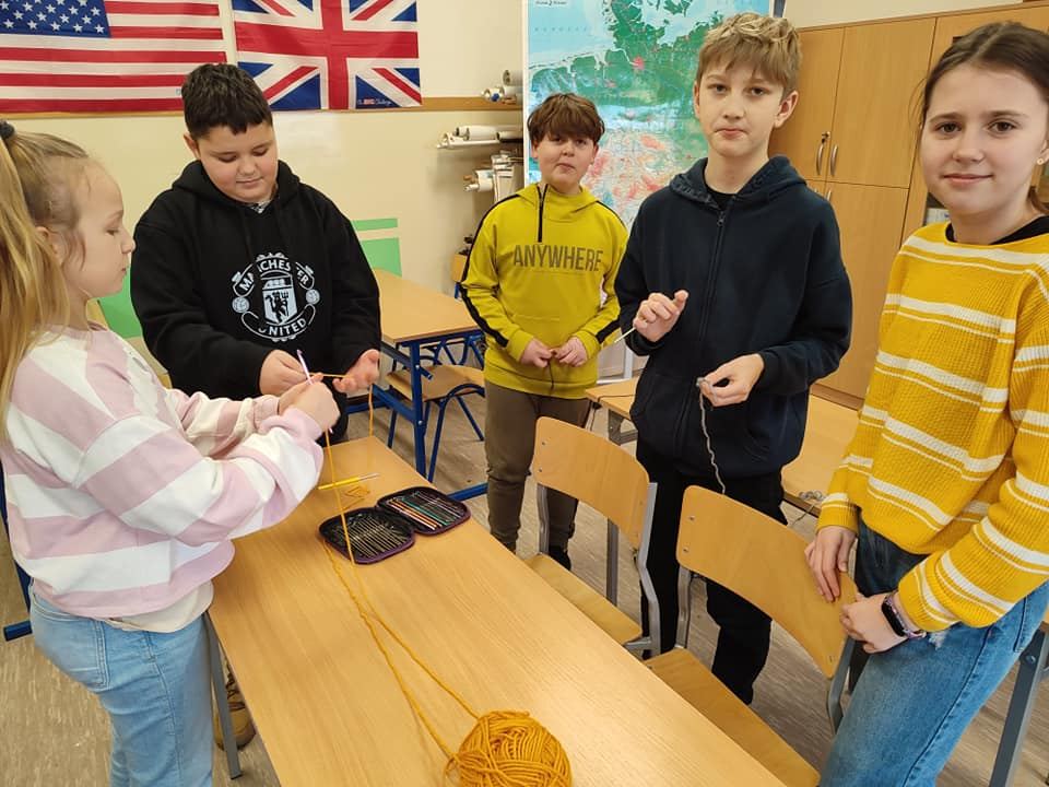 Zajęcia kształtujące kreatywność uczniowie klasy V spędzili na poznawaniu tajników szydełkowania. Bardzo uważnie skupili się na wskazówkach przekazywanych od kolegów i koleżanek, którzy mieli styczność z szydełkiem. Co prawda było trochę trudności na początku, ale kolejne zajęcia minęły w bardzo inspirujących pomysłach.