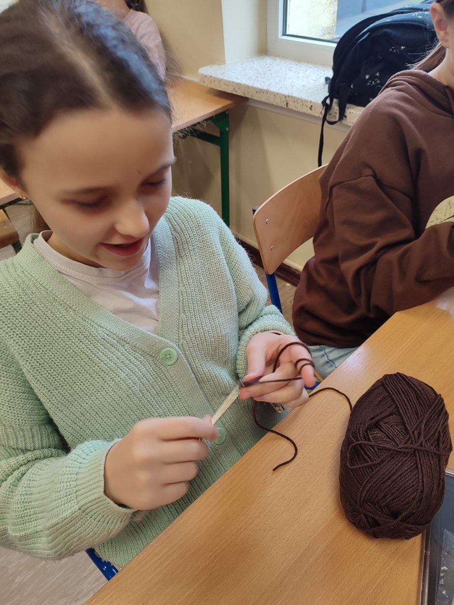 Zajęcia kształtujące kreatywność uczniowie klasy V spędzili na poznawaniu tajników szydełkowania. Bardzo uważnie skupili się na wskazówkach przekazywanych od kolegów i koleżanek, którzy mieli styczność z szydełkiem. Co prawda było trochę trudności na początku, ale kolejne zajęcia minęły w bardzo inspirujących pomysłach.