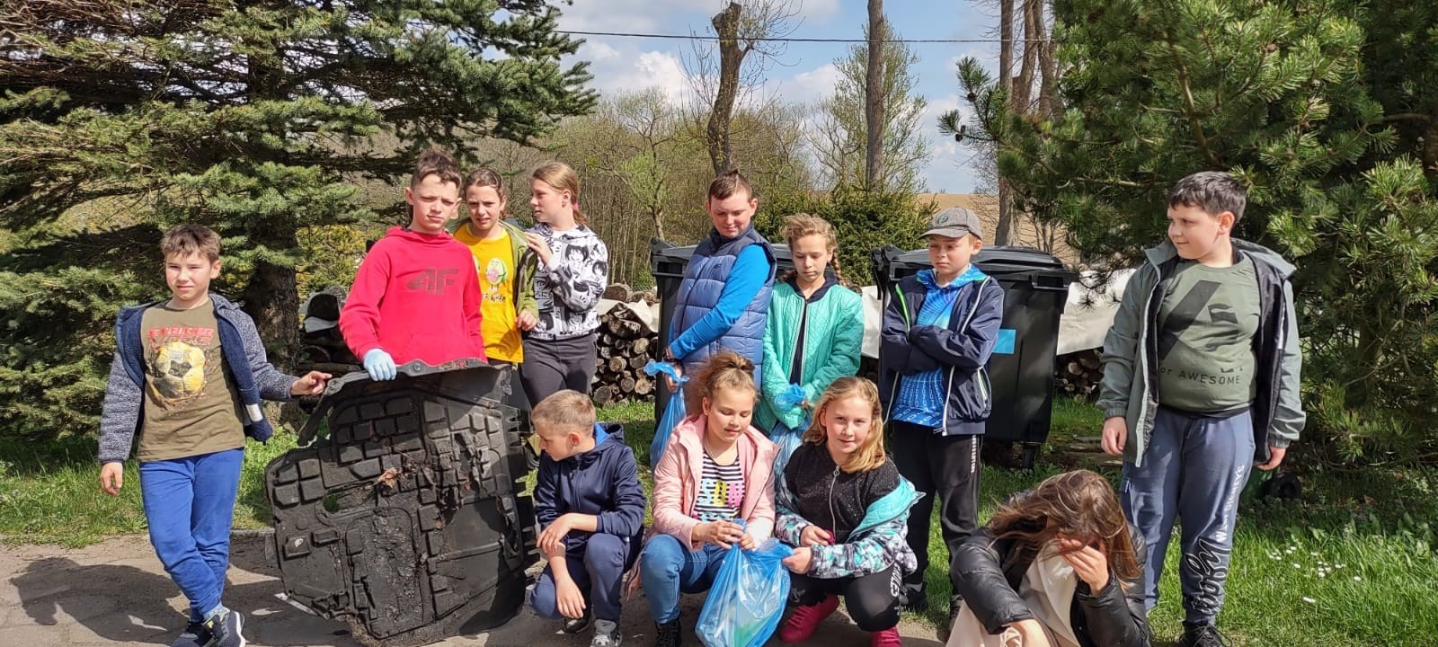 Nasi uczniowie po wiedzy teoretycznej zabrali się do pracy. Zakasali rękawy i wspólnymi siłami wysprzątali teren wokół szkoły oraz pobliskie tereny. Teraz z wielką przyjemnością patrzy się na rozkwitające wokół drzewa i krzewy.