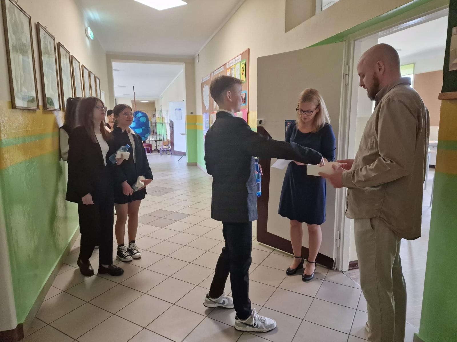 Po wylosowaniu numeru stolika, z uśmiechem na twarzy zasiedli do swoich miejsc i cierpliwie czekali na arkusze. Kiedy już je otrzymali z wielkim zapałem ruszyli do napisania rozprawki.