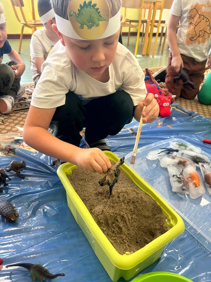 Dziś obchodziliśmy święto znanych, prehistorycznych stworzeń. Dzieci poznały historię dinozaurów, dowiedziały się kiedy żyły, czym się żywiły i jak wyglądały. Rozmawialiśmy na temat pracy paleontologa i wspólnie dokonaliśmy ,,wykopalisk”.