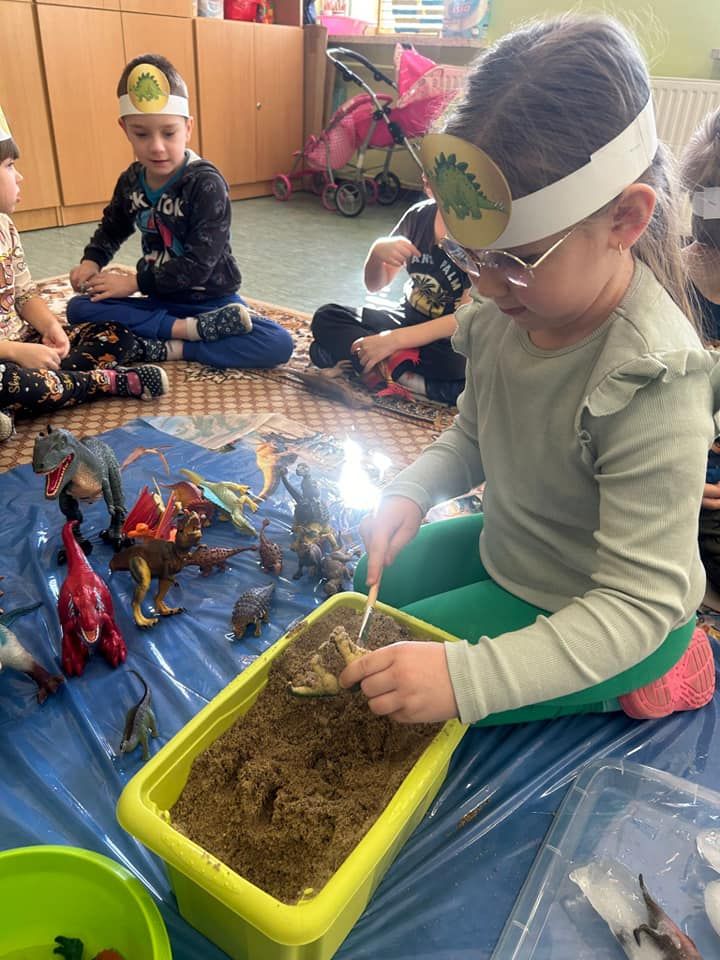 Dziś obchodziliśmy święto znanych, prehistorycznych stworzeń. Dzieci poznały historię dinozaurów, dowiedziały się kiedy żyły, czym się żywiły i jak wyglądały. Rozmawialiśmy na temat pracy paleontologa i wspólnie dokonaliśmy ,,wykopalisk”.