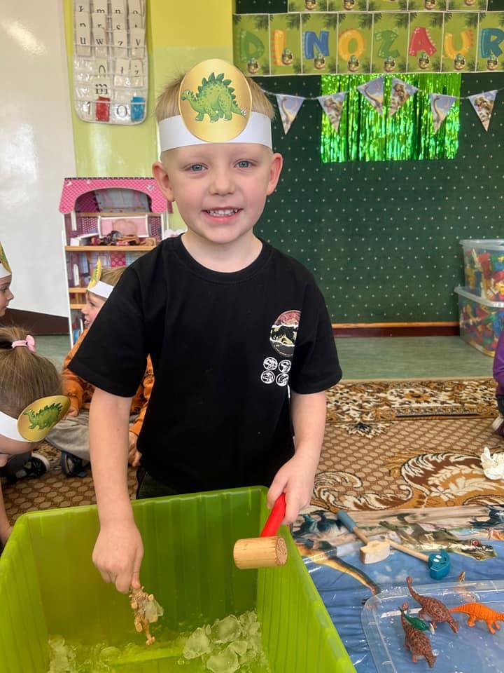 Dziś obchodziliśmy święto znanych, prehistorycznych stworzeń. Dzieci poznały historię dinozaurów, dowiedziały się kiedy żyły, czym się żywiły i jak wyglądały. Rozmawialiśmy na temat pracy paleontologa i wspólnie dokonaliśmy ,,wykopalisk”.