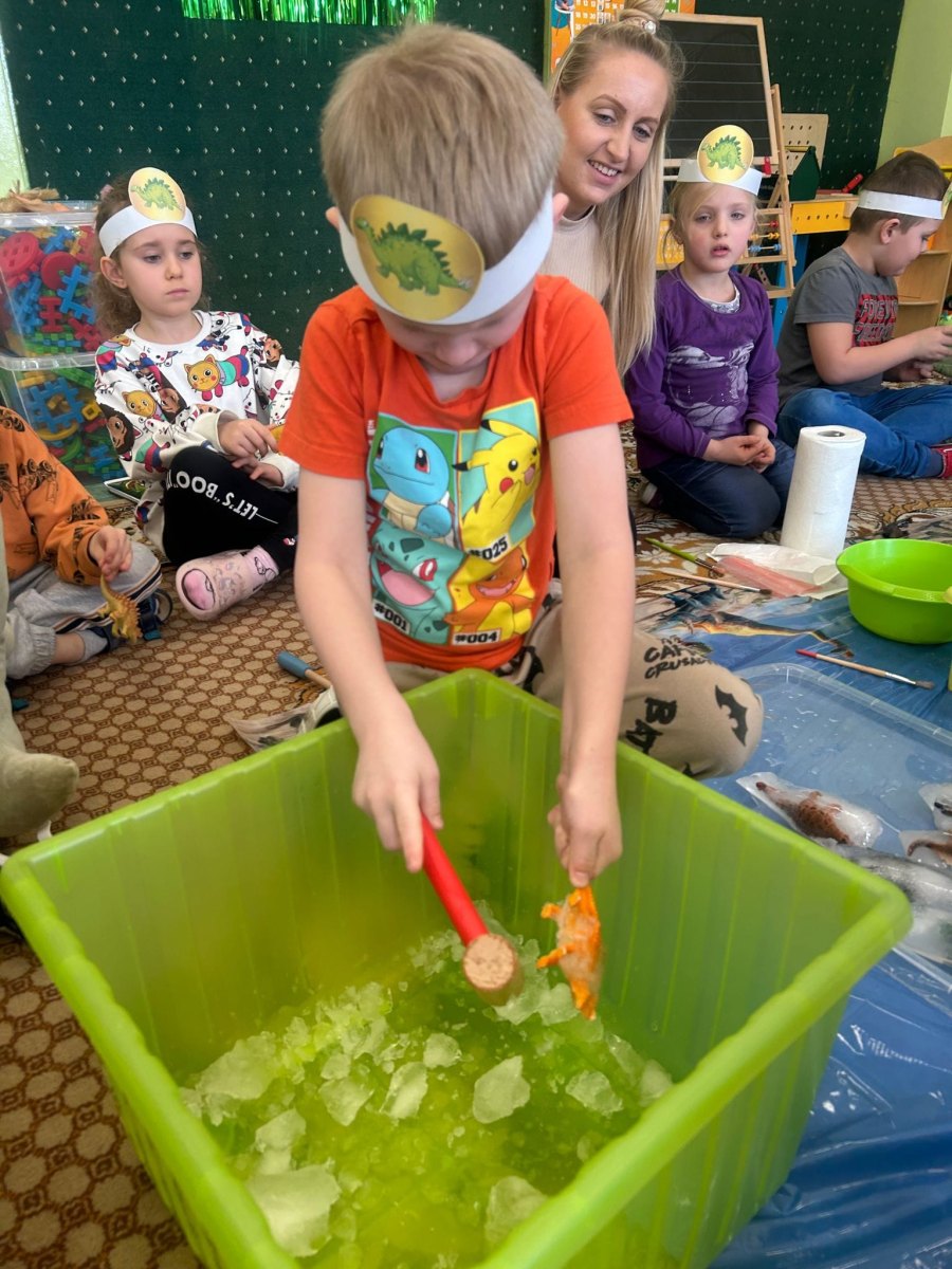 Dziś obchodziliśmy święto znanych, prehistorycznych stworzeń. Dzieci poznały historię dinozaurów, dowiedziały się kiedy żyły, czym się żywiły i jak wyglądały. Rozmawialiśmy na temat pracy paleontologa i wspólnie dokonaliśmy ,,wykopalisk”.