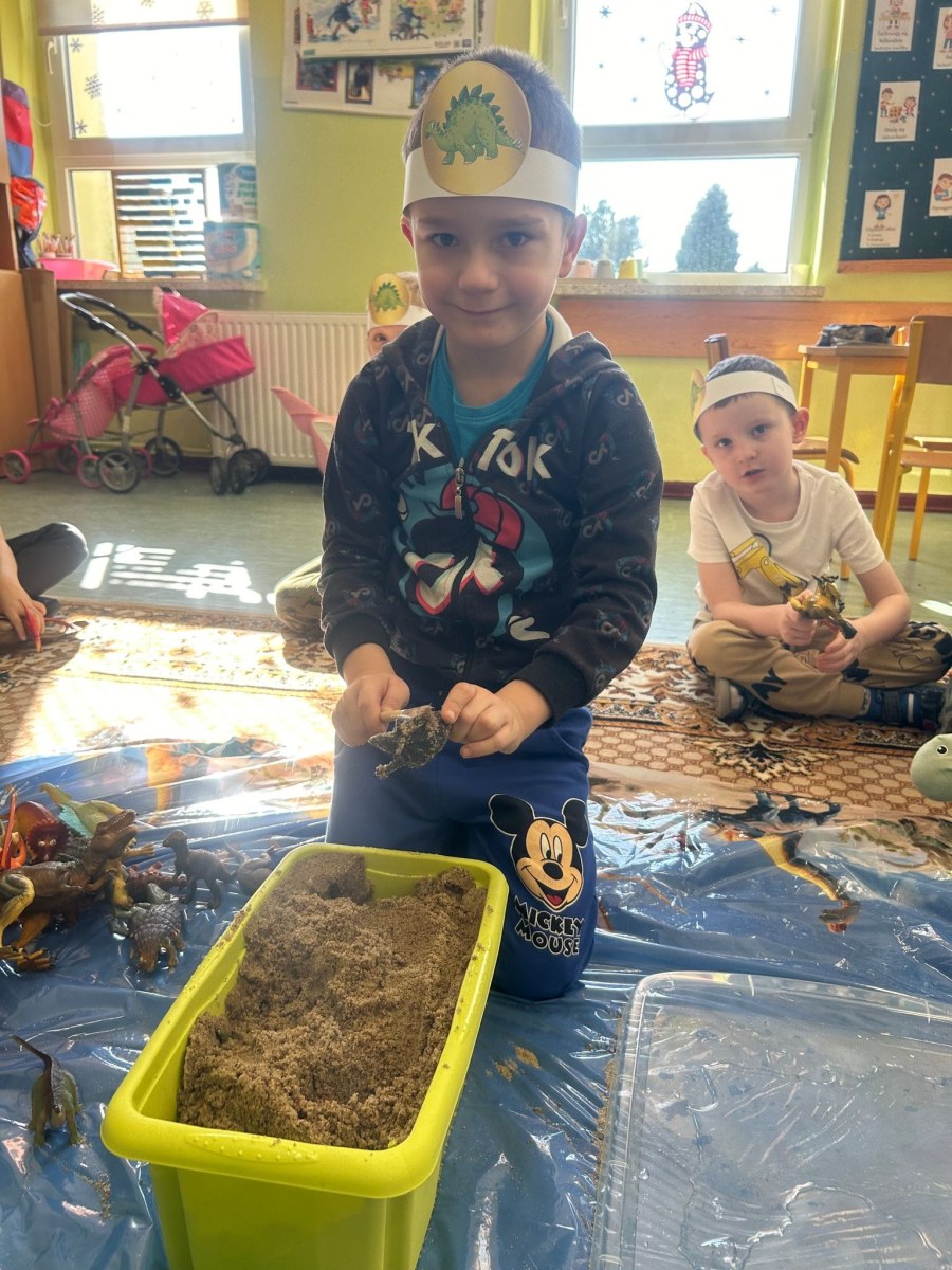 Dziś obchodziliśmy święto znanych, prehistorycznych stworzeń. Dzieci poznały historię dinozaurów, dowiedziały się kiedy żyły, czym się żywiły i jak wyglądały. Rozmawialiśmy na temat pracy paleontologa i wspólnie dokonaliśmy ,,wykopalisk”.