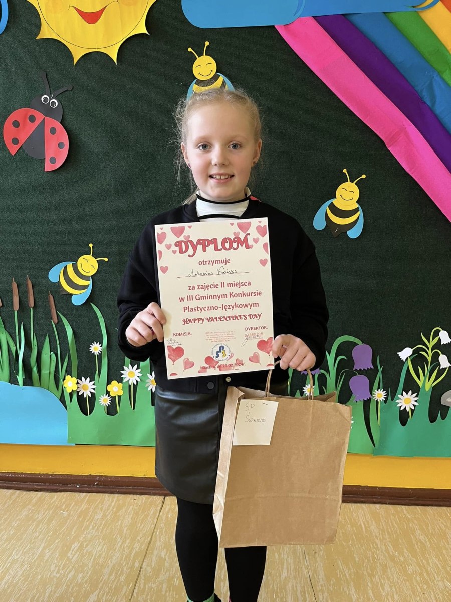 Serdeczne gratulacje dla Tosi Końskiej za zajęcie II miejsca w III Gminnym Konkursie Plastyczno-Językowym „Happy Valentine’s Day”. W powiatowym konkursie ”Bezpieczne zabawy zimowe”, Lenie Urbaniak gratulujemy zajęcia III miejsca, a Vanessie Brakowskiej wyróżnienia.