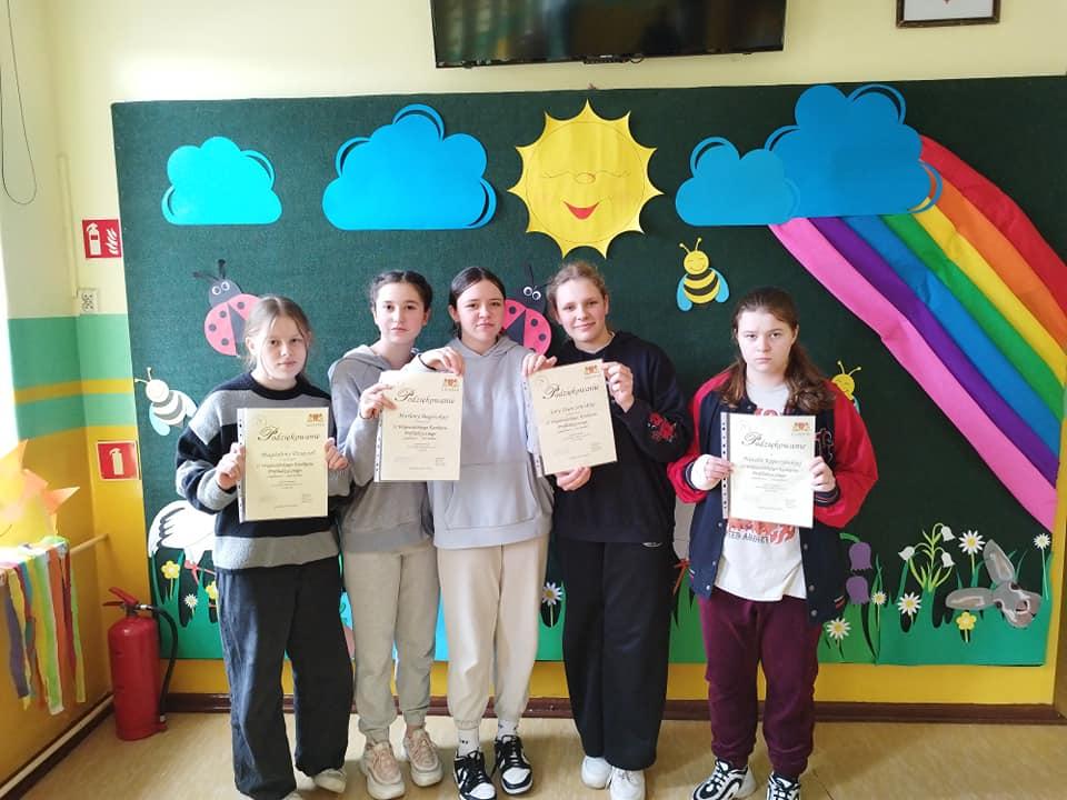Uczennice klasy siódmej w sobotę (6 kwietnia) reprezentowały naszą szkołę w II Wojewódzkim konkursie profilaktycznym ,,Zagubieni w……. sieci mediów” w Szkole Podstawowej nr 48 w Gdańsku. Zmagały się z zadaniami w 5 konkurencjach. Rywalizacja była duża. Dziewczynom zabrakło niewiele punktów, aby zdobyć miejsca na podium. Wszystkie otrzymały podziękowanie za udział oraz nagrody pocieszenia..