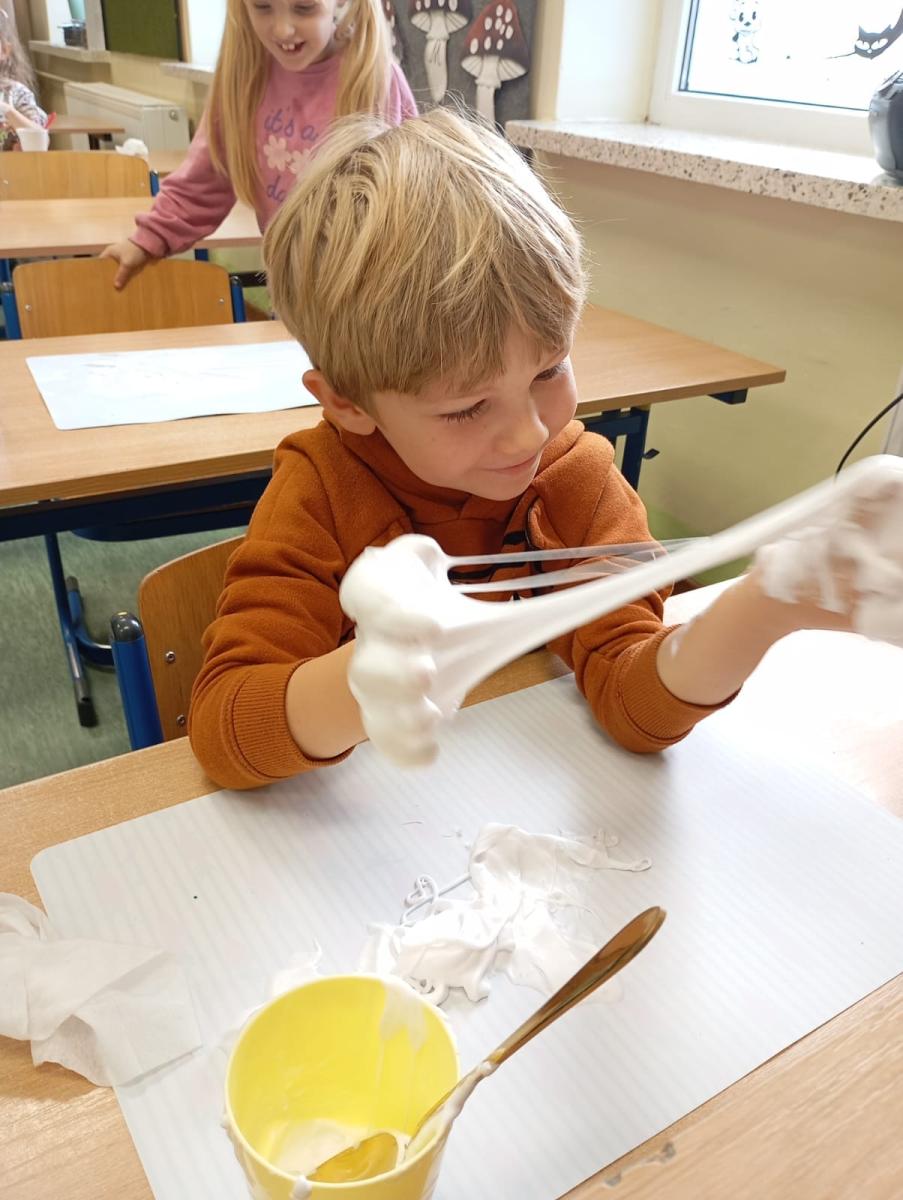 Było dużo zabawy, doznań sensorycznych, śmiechu i wytrwałości, bo jak to w chemii – nie zawsze wszystko udaje się za pierwszym razem 😉 dziękujemy Pani Monice za lekcję i mamy nadzieję spotkać się kolejny raz ☺️.