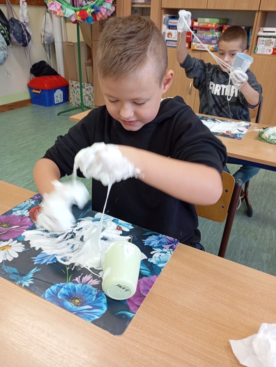 Było dużo zabawy, doznań sensorycznych, śmiechu i wytrwałości, bo jak to w chemii – nie zawsze wszystko udaje się za pierwszym razem 😉 dziękujemy Pani Monice za lekcję i mamy nadzieję spotkać się kolejny raz ☺️.