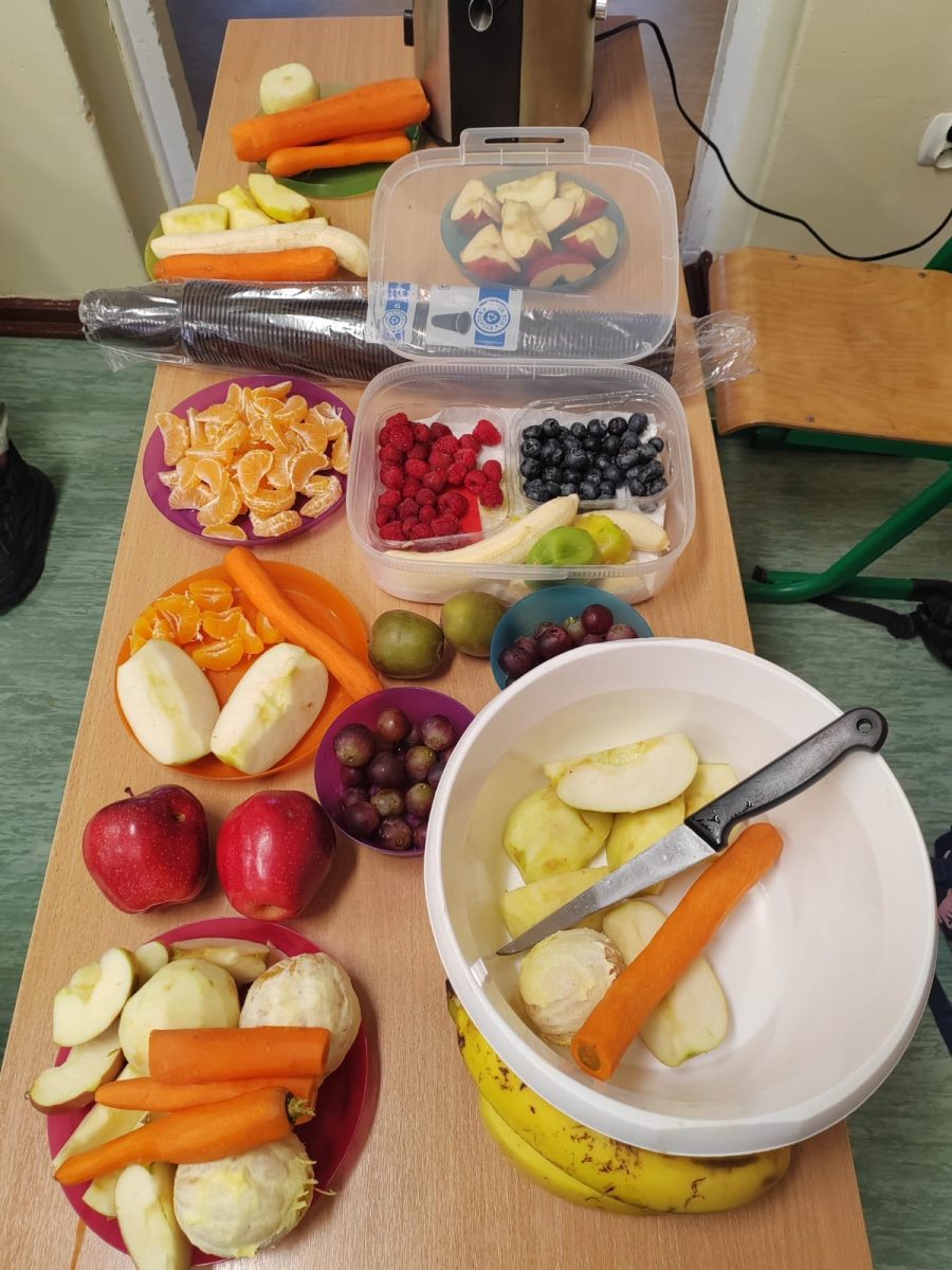 W ramach zajęć kształtujących kreatywność uczniowie klasy trzeciej nabyli umiejętność przygotowania soków owocowo – warzywnych. Jednocześnie poznały walory odżywcze warzyw i owoców oraz zasady bezpiecznego korzystania z sokowirówki. Przygotowany sok wyglądał apetycznie i cieszył się dużym powodzeniem.