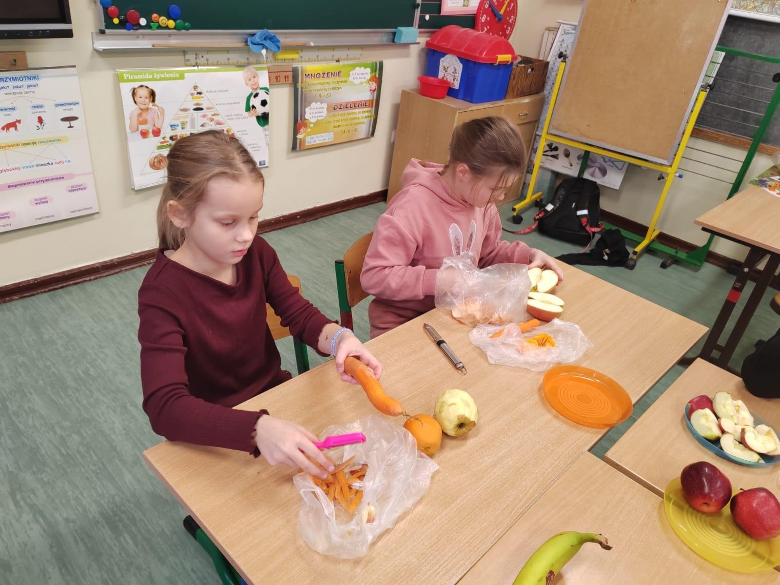 W ramach zajęć kształtujących kreatywność uczniowie klasy trzeciej nabyli umiejętność przygotowania soków owocowo – warzywnych. Jednocześnie poznały walory odżywcze warzyw i owoców oraz zasady bezpiecznego korzystania z sokowirówki. Przygotowany sok wyglądał apetycznie i cieszył się dużym powodzeniem.