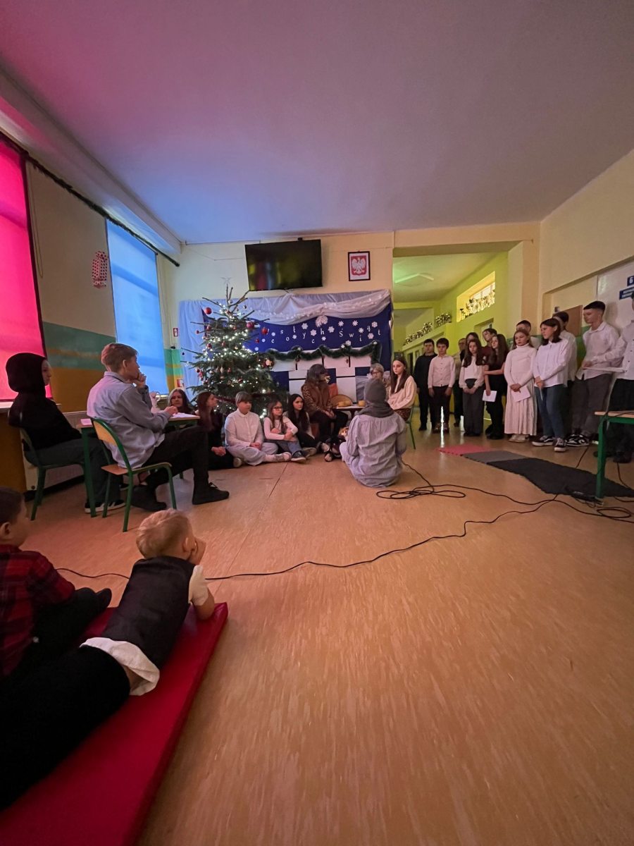 Tymi słowami klasa siódma rozpoczęła wigilijne przedstawienie. Zwracając uwagę na fakt, że nie należy oceniać książki po okładce i że nie są najważniejsze prezenty materialne, drogie. Najwspanialszy prezent to ten dany prosto od serca. Krótka historia, ale jakże wzruszająca. Na niektórych twarzach pojawiły się łzy wzruszenia. Do tego śpiew kolęd i gra na flecie sprawiły, że to był naprawdę magiczny czas.