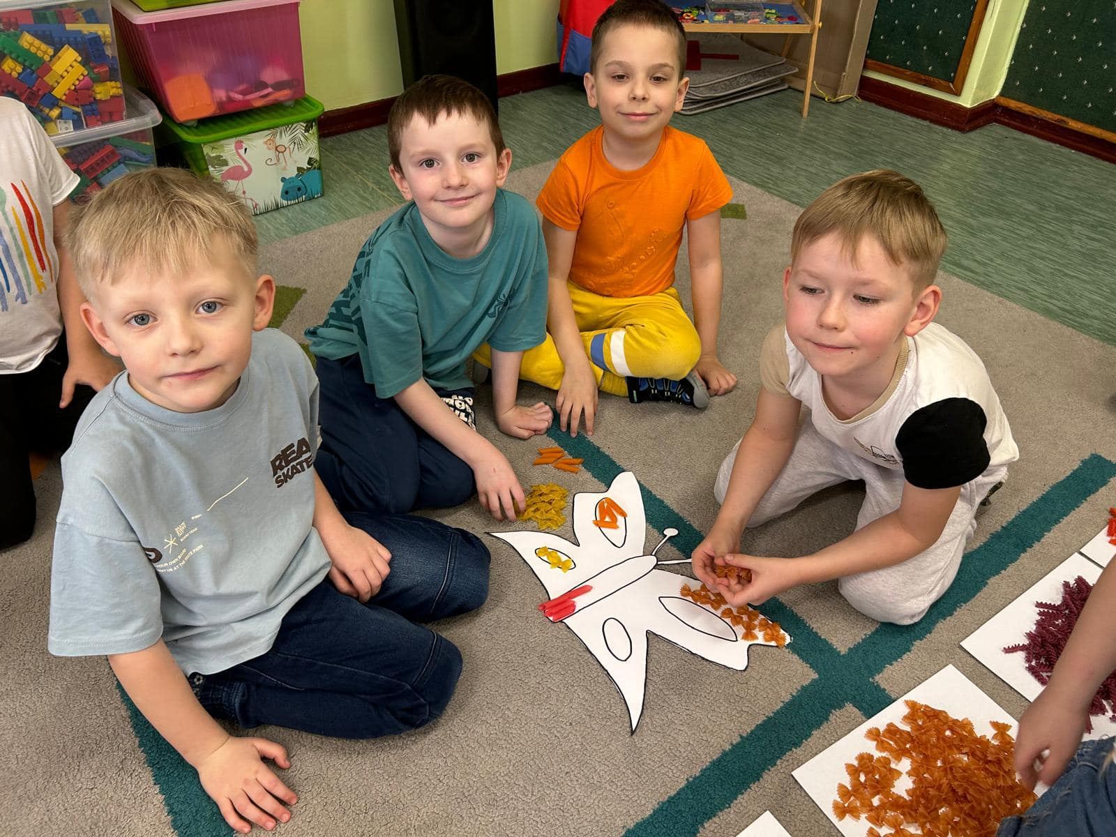 * Zajęcia sensoryczne z makaronem: Doskonaliliśmy zmysły poprzez zabawy z makaronem, który posłużył nam do tworzenia motylkowych wzorów.