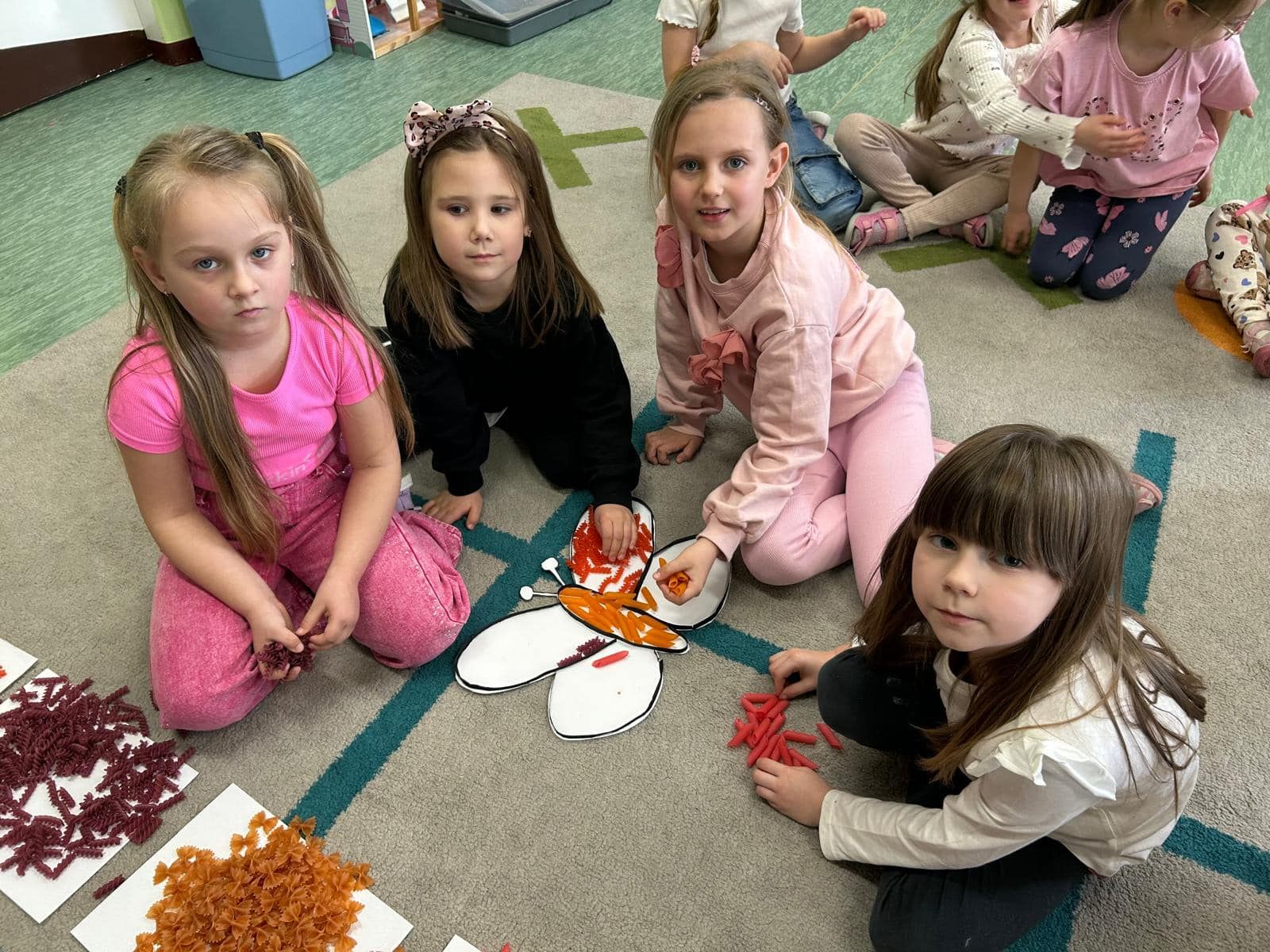 * Zajęcia sensoryczne z makaronem: Doskonaliliśmy zmysły poprzez zabawy z makaronem, który posłużył nam do tworzenia motylkowych wzorów.