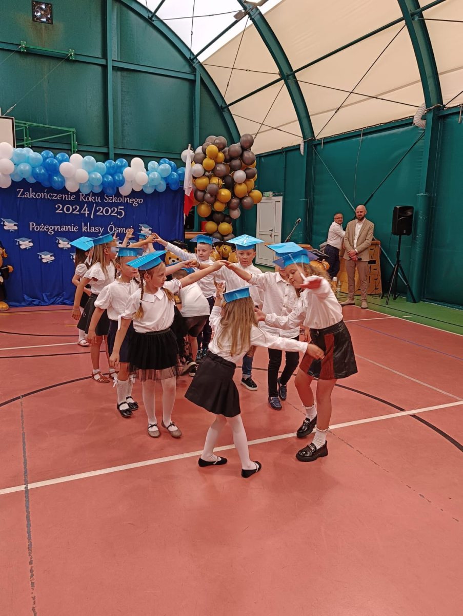 Szczególne miejsce w programie zajęło symboliczne pożegnanie klasy ósmej, która kończy swoją edukację w naszej szkole. Uczniowie klasy siódmej z serdecznością i wzruszeniem pożegnali swoich starszych kolegów i koleżanki, życząc im sukcesów i odwagi w podejmowaniu kolejnych wyzwań. Klasa ósma w pięknych słowach podziękowała nauczycielom, pracownikom szkoły oraz młodszym uczniom – za wspólne lata, wsparcie i wspomnienia.