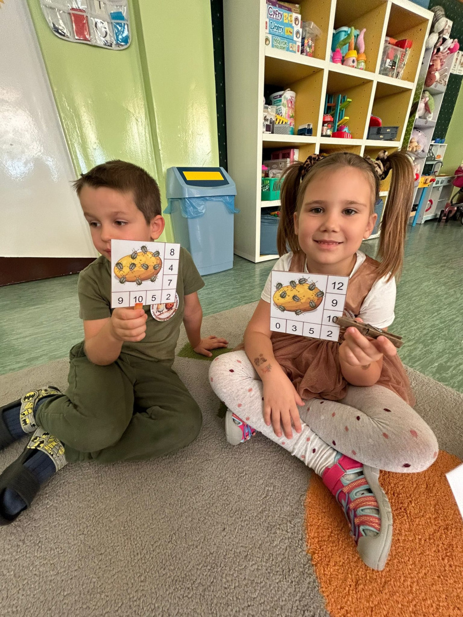 Podczas zajęć matematycznych dzieci rozwiązywały zadania w zabawie „Policz stonki” – liczyły owady, porównywały ich liczebność i odpowiadały na proste pytania matematyczne.