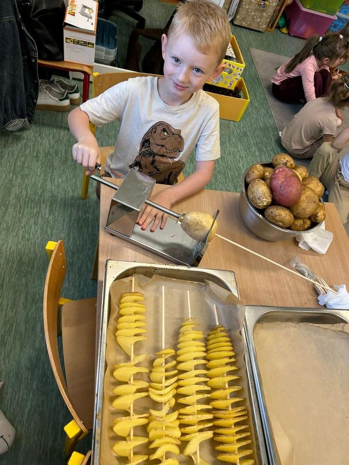 W grupie „Smerfy” obchodziliśmy dziś Dzień Pieczonego Ziemniaka. Dzieci poznały budowę ziemniaka – dowiedziały się, że ma skórkę, oczka i miąższ, a także poznały cykl jego rozwoju: od sadzenia bulwy, poprzez wzrost rośliny i kwitnienie, aż do jesiennych wykopków.