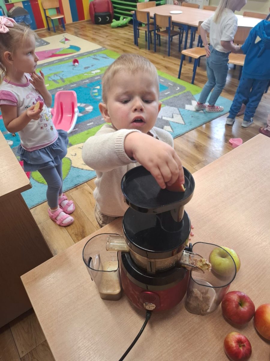 Dzień Jabłka przez admin | 29 września, 2025 0 komentarzy Dzień Jabłka w grupie Biedronek. Dzisiejszy dzień upłynął biedroneczkom pod znakiem zdrowia, smaku i świetnej zabawy. Dzieci miały okazję próbować jabłuszka, robić pyszny sok w sokowirówce oraz malowały jabłuszka z papierowych talerzyków. 555650109_1335350941924475_7715988611050821145_n Zdjęcie 5 z 29