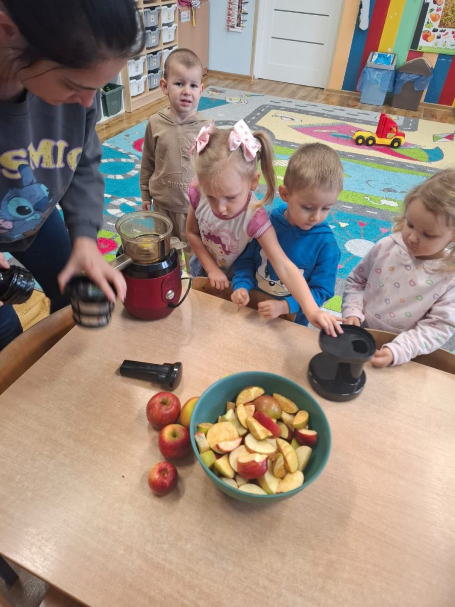 Dzień Jabłka przez admin | 29 września, 2025 0 komentarzy Dzień Jabłka w grupie Biedronek. Dzisiejszy dzień upłynął biedroneczkom pod znakiem zdrowia, smaku i świetnej zabawy. Dzieci miały okazję próbować jabłuszka, robić pyszny sok w sokowirówce oraz malowały jabłuszka z papierowych talerzyków. 555754637_1335350885257814_3173501240015565253_n Zdjęcie 3 z 29