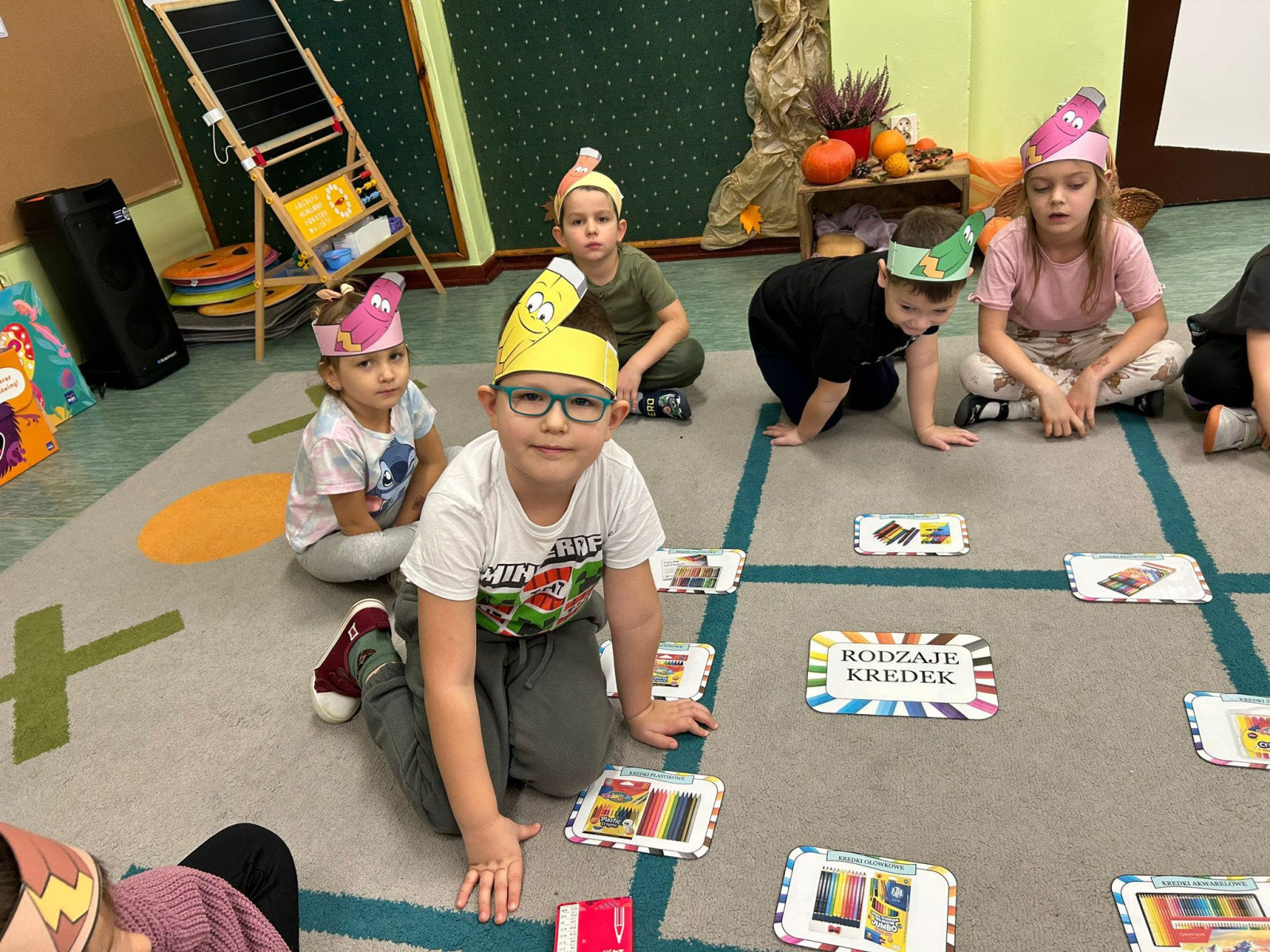 Dzieci oglądały film edukacyjny o tym, jak powstają kredki, poznając etapy ich tworzenia. Następnie zapoznały się z różnymi rodzajami kredek – ołówkowymi, świecowymi, pastelami – obserwując ich wygląd i działanie.
