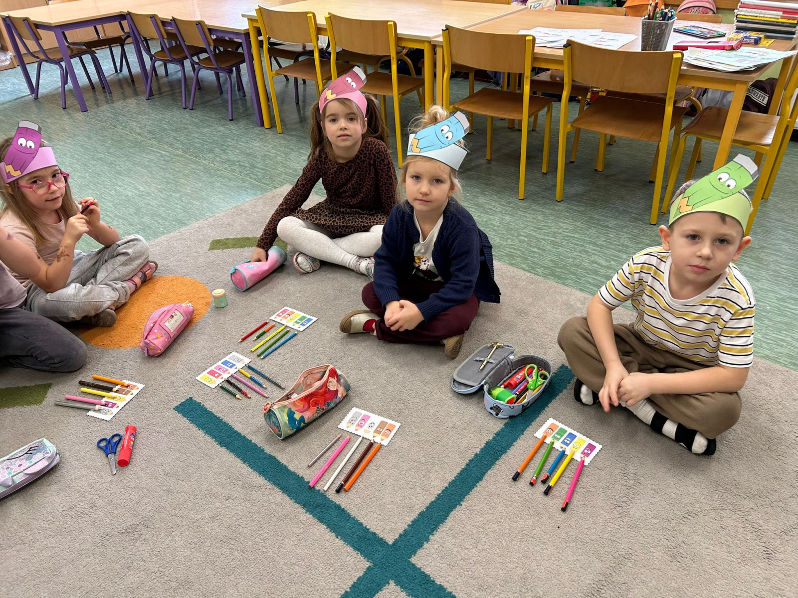 Dzieci oglądały film edukacyjny o tym, jak powstają kredki, poznając etapy ich tworzenia. Następnie zapoznały się z różnymi rodzajami kredek – ołówkowymi, świecowymi, pastelami – obserwując ich wygląd i działanie.