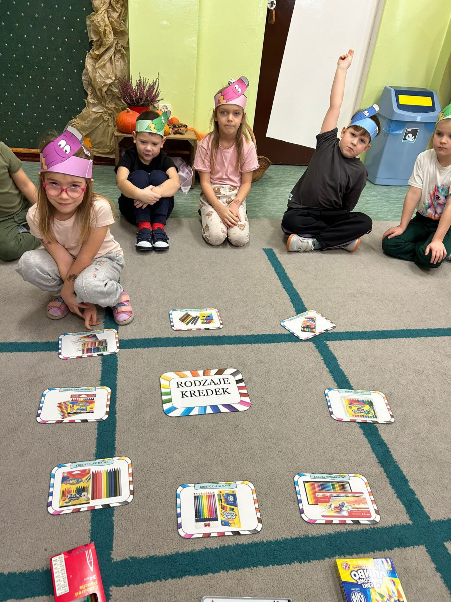 Dzieci oglądały film edukacyjny o tym, jak powstają kredki, poznając etapy ich tworzenia. Następnie zapoznały się z różnymi rodzajami kredek – ołówkowymi, świecowymi, pastelami – obserwując ich wygląd i działanie.