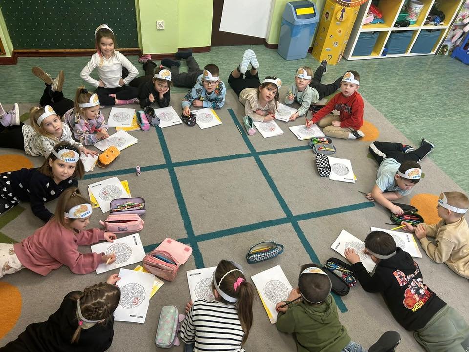 Po upieczeniu pizzy Smerfy, jako młodsza grupa, z dumą poczęstowały uczniów klasy 1. Była to wspaniała okazja do integracji, nauki dzielenia się oraz budowania relacji między młodszymi i starszymi dziećmi.