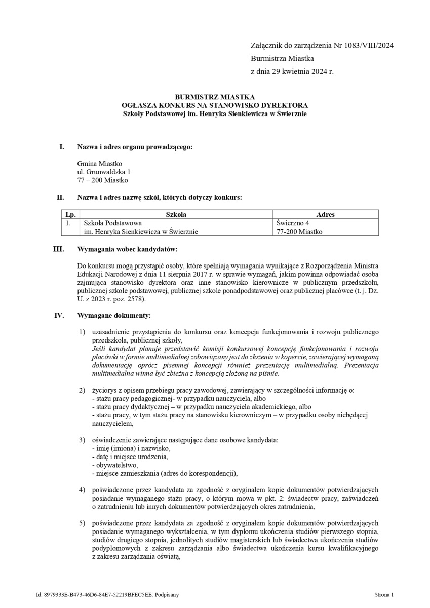 Burmistrz Miastka ogłasza konkurs na stanowisko dyrektora Szkoły Podstawowej im. Henryka Sienkiewicza w Świerznie. Szczegóły procesu wyłaniania dyrektora są zawarte w zarządzeniu Burmistrza Miastka nr 1083/VIII/2024 z dnia 29 kwietnia 2024 r.