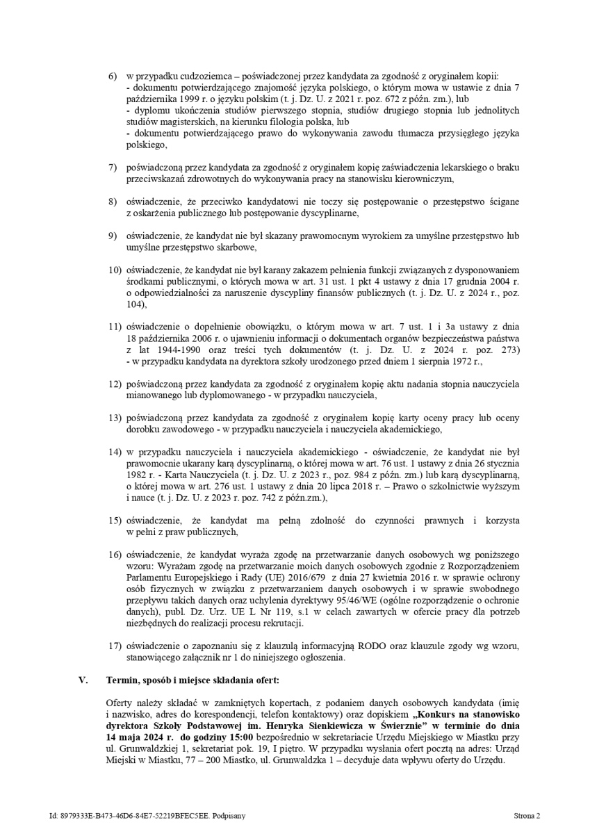 Burmistrz Miastka ogłasza konkurs na stanowisko dyrektora Szkoły Podstawowej im. Henryka Sienkiewicza w Świerznie. Szczegóły procesu wyłaniania dyrektora są zawarte w zarządzeniu Burmistrza Miastka nr 1083/VIII/2024 z dnia 29 kwietnia 2024 r.